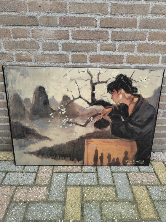 Beautiful painting by Nico Vrielink, published by Holland Art Gallery. The work depicts a woman in a serene, Eastern setting with blossoming trees and mountains in the background. An atmospheric artwork that radiates tranquility.