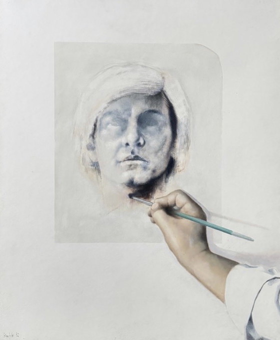 The face, constructed through delicate modeling and a subtle interplay of values, seems to gradually emerge from the pictorial surface. The presence of the hand holding the brush introduces a mise en abyme of the artistic gesture, reinforcing the dialogue between the painter, his subject, and the act of creation.