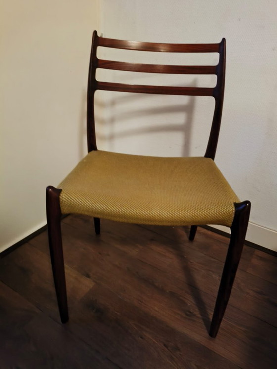 This beautiful dining chair by Niels Otto Moller, model 78, is a real eye-catcher for your interior. Crafted from elegant rosewood, this chair exudes a timeless charm that fits perfectly in a Mid-Century Modern setting. The warm brown hue of the wood combines beautifully with the yellow textile seat, creating a playful yet stylish contrast.