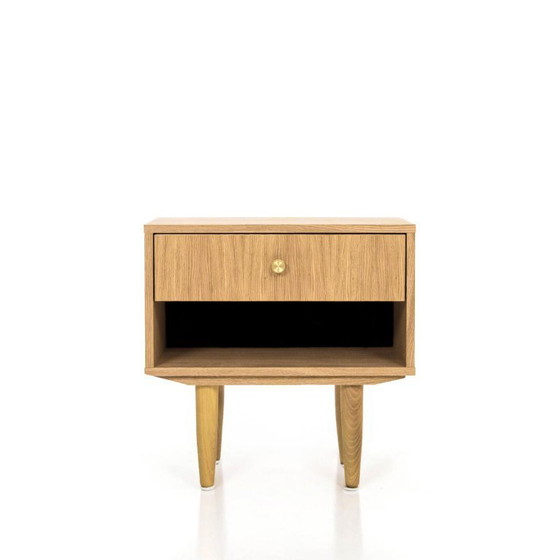 This delightfully shaped model performs well as a bedside table. We fitted it with one drawer on Blum concealed runners using the Blumotion system. Thanks to this system, opening and closing of drawers is a very light and extremely quiet process. Underneath, there is an open shelf where you can easily store taller items or a whole tower of evening reading material.