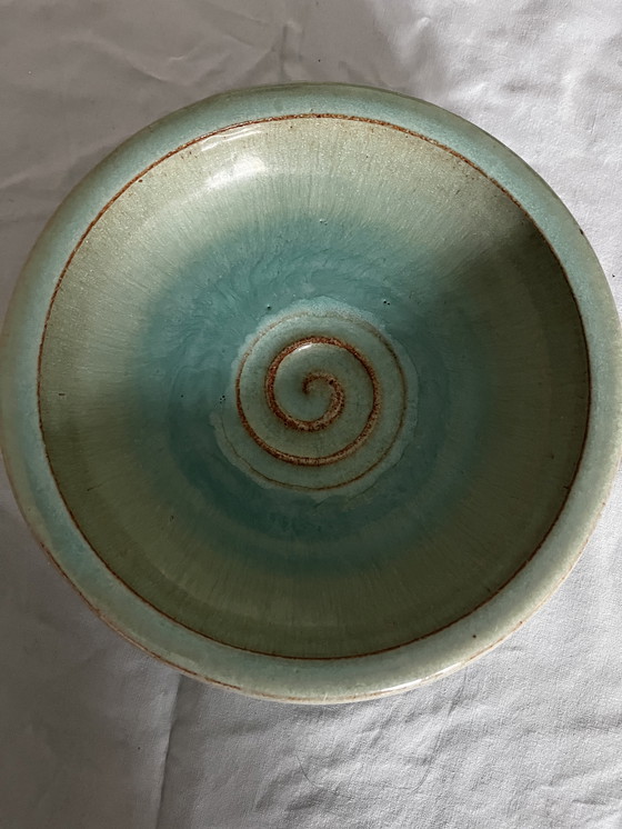 Discover the timeless elegance of this vintage Nittsjö bowl, a masterpiece of ceramic craftsmanship. Its soothing green hue, accented by earthy brown tones, creates a harmonious aesthetic that will enhance any setting.