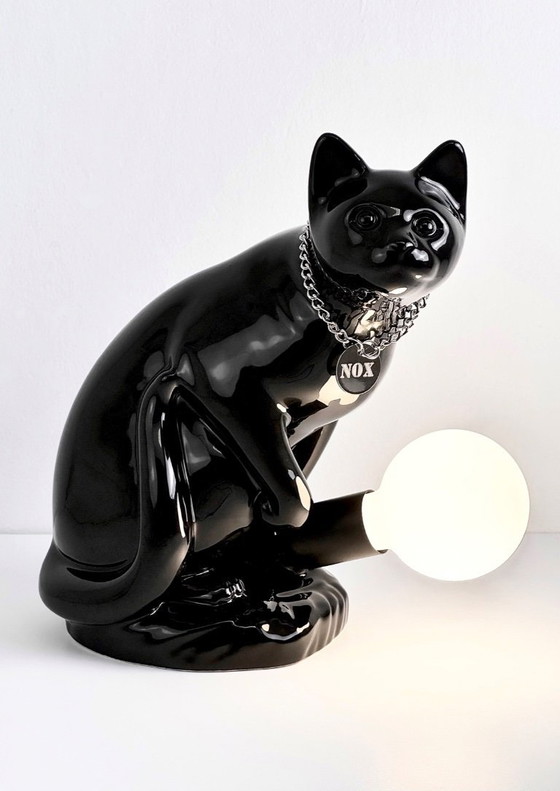 The design is a study in deliberate contrast: named after Nox, the Roman goddess of the night, who symbolizes mystery and depth. The central figure—the black cat—is a powerful motif representing intuition, independence, and the unseen. Yet this is no shadowy figure; it is full of character. Its posture, combined with the slightly rebellious chain accent, gives it a charming playfulness. The cat actively embraces the simple, luminous sphere, creating a dramatic interplay between the dark, gleaming body and the soft light that defines "NOX."