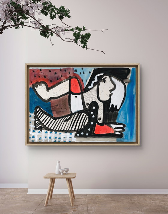The generous 100 × 70 cm format accentuates the painting's physical presence and allows the drawing to unfold with breadth. The figure occupies the space with confidence, creating a composition that is both dynamic and balanced.