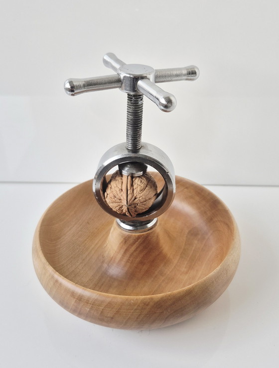 Unusual nutcracker made of solid turned oak and metal elements. Manufacturer unknown, but similar to the nutcracker by Carl Auböck (Austria). Dimensions approx.: H max 16 x 15.3 cm diameter.