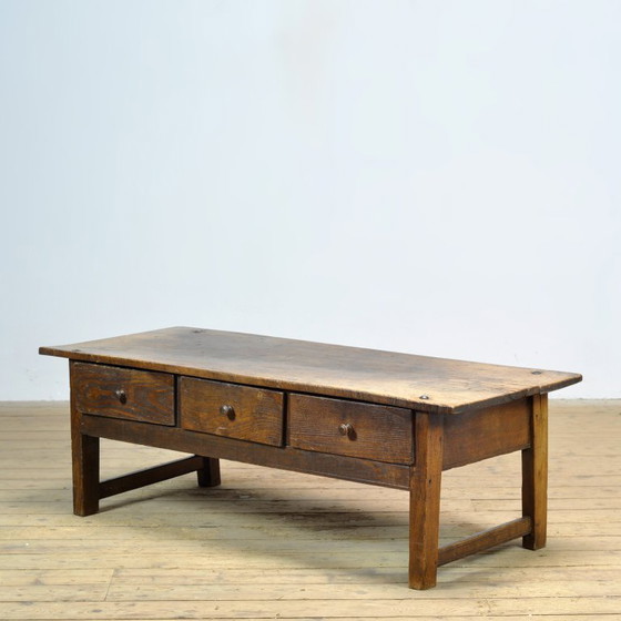 An oak coffee table dating from circa 1820, executed in a timeless and functional design. This authentic piece of furniture features three drawers, crafted with traditional dovetail joints, testifying to high-quality artisanal craftsmanship. The tabletop displays a beautiful patina developed over the years, subtly emphasizing the historical charm and lived-in character of the table. The warm color of the oak and the understated, elegant design make this piece of furniture a versatile and stylish element within both classic and contemporary interiors.