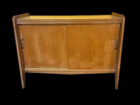 Oak sideboard with compass legs typical of the 1950s, original melamine top, a large shelf behind the sliding doors.