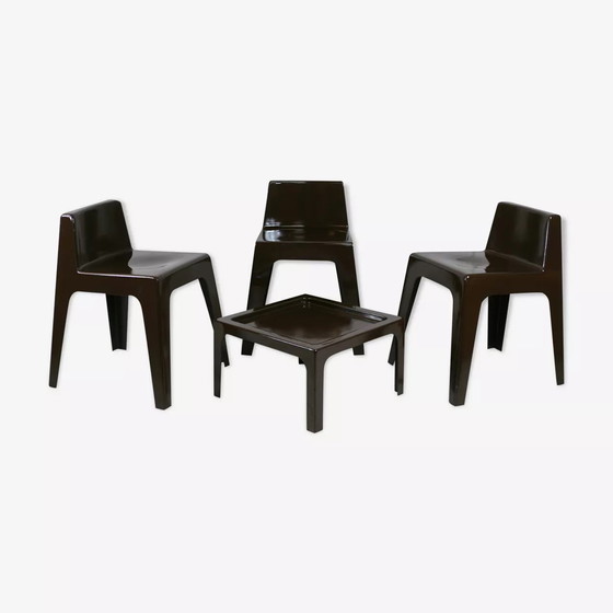 Ode set of 3 chairs and 1 coffee table, fiberglass, chocolate color, circa 1970. Wear consistent with age, in very good condition (very discreet scratches). Space Age design. Chairs/ Height 62 cms, depth 50 cms, width 48 cms, seat height 44 cms. Coffee table/ Height 28 cms, side 47 cms.