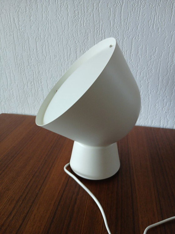 This lamp is known for its sleek, minimalist design and soft, indirect light that creates a warm atmosphere in any room. Perfect as a desk lamp, nightlight, or accent lighting in a modern interior. The lamp is in excellent condition and works perfectly. Material: powder-coated metal with a plastic diffuser. Color: white. Dimensions: approx. height 31 cm, width 24 cm, depth 25 cm. E14 socket.