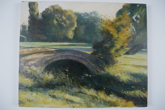 Charming oil painting on canvas depicting a Norman landscape, as indicated by a label on the back: "Old Bridge in Normandy." Unidentified signature in the lower left corner (perhaps a Japanese painter?). Undated but likely from the 2000s. Oil on canvas mounted on a stretcher.
