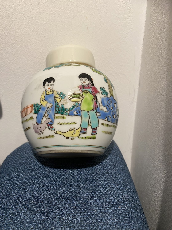 Features: It is a polychrome (multicolored) decorated jar with a lid.