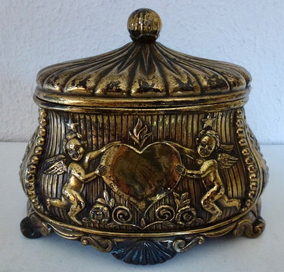 Antique French Art Nouveau jewelry box, gilded in bronze with decorative reliefs of cherubs holding a heart.