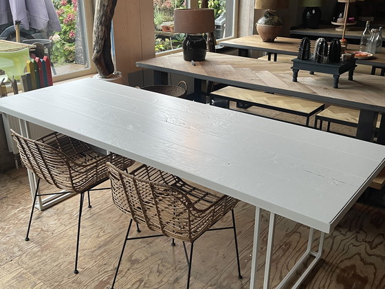 Beautiful white-painted dining table. Reclaimed oak. Steel rim and base. Sigma RAL 9016 finish. Dimensions: 240 x 87 cm.