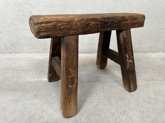 Old wooden stool with mortise and tenon joints. In several places the wood was filled with new pieces of wood. Visible imperfections so and therefore extra striking in a wabi sabi interior. Sits very firmly. Height: 23cm. Width: 30cm. Depth: 20cm. Weight: 1.3kg.