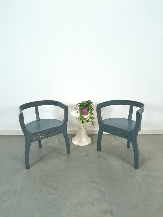 Vintage wooden chairs. The chairs come from Sweden and have a blue gray color and nice detail are the painted flowers on the chairs. The chairs are nice to use on a balcony or under the porch.