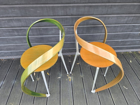 The Revers chair was designed by Andrea Branzi in 1993 and is no longer produced by Cassina. This Italian designer chair features a design of inverted ribbons in bentwood and a round wooden seat, supported by a matte anodized steel frame.