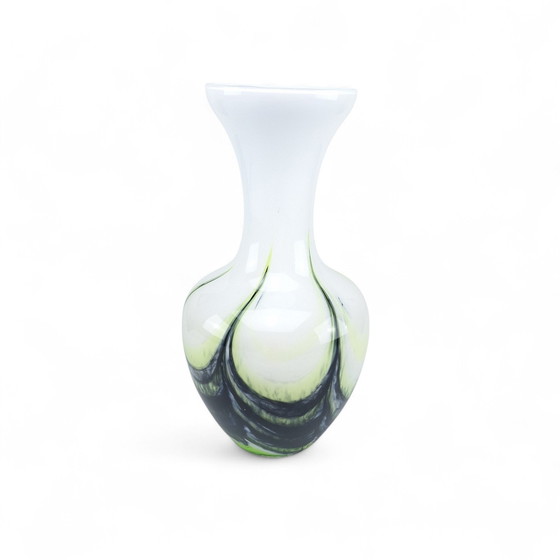 This opal glass vase was designed in Florence by Carlo Moretti. It impresses with its elegant shape with a narrow neck and bulbous body as well as the flowing pattern in black and green on a white background.