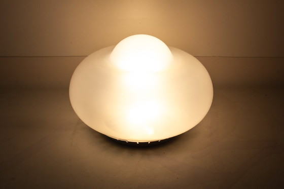 A soft, rounded Murano lamp in opaline glass with a subtle blue tint when off. The double-layered shape creates a diffused, even glow once lit. The perforated metal base adds a small industrial contrast to the otherwise smooth volume.