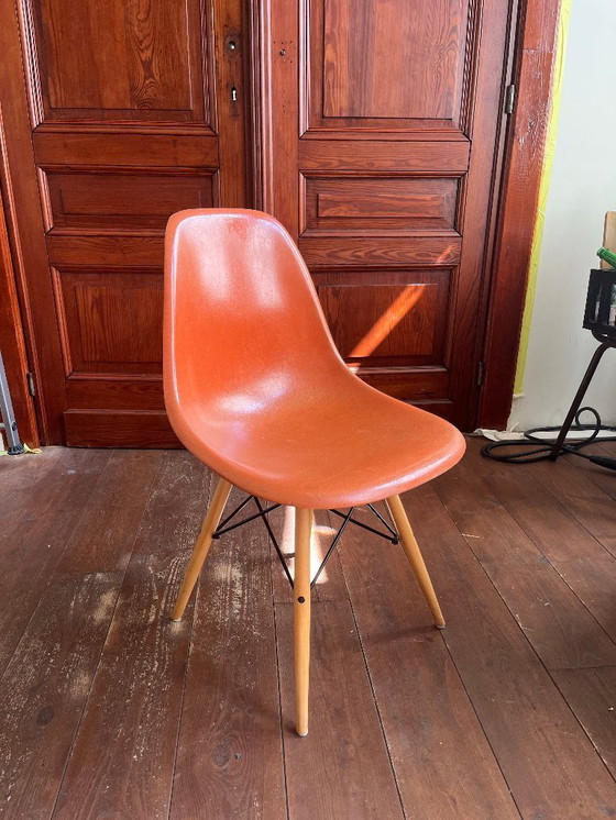 Orange Vitra Eames side chair DSW by Herman Miller (labeled)