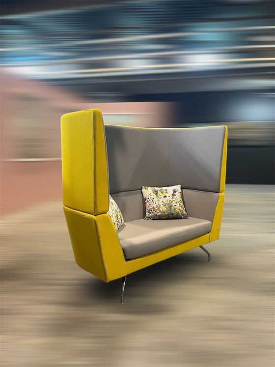 This charming Orangebox bench is a great addition to any office thanks to its sound-dampening qualities, but it also works perfectly at home as a cozy and relaxing reading bench. The exterior is canary yellow and the interior is mouse-gray fabric, so it's a nice, cheerful color. There are a few small stains and lint, but nothing serious. The high backrest provides plenty of comfort and privacy.