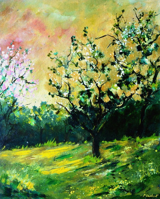 Discover the serenity of an orchard in full spring bloom with this captivating artwork. Vibrant shades of green and yellow blend harmoniously with delicate touches of pink, evoking a peaceful, bucolic scene.