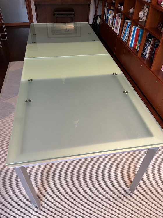 It is an original 2002 B&B Italia table designed by Paolo Piva called Atavola (see sticker). H 74cm, L 240cm, W 90cm. Extendable to 320 cm by sliding two sides and inserting an included middle wooden white board. Frame in mat Aluminum, top in glass 1.5 cm thick. Excellent conditions, only one small glass defect (<1cm), see picture.