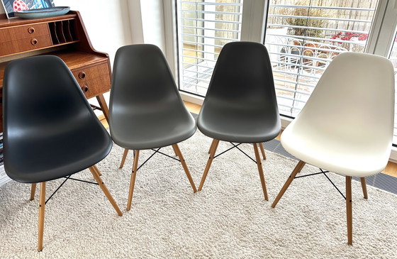 Four original, beautiful Vitra Eames Plastic Chairs in basalt gray (2x), white (1x), and black (1x) are for sale. All four chairs are in excellent condition!