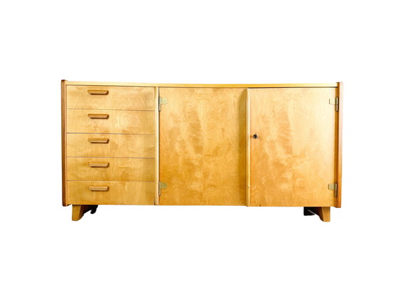 We are offering a beautiful and very rare vintage sideboard by WK Möbel from the "WK S 8 - Constructa" series for sale. The design was created by Arno Lambrecht and was specially designed for small social housing apartments in the post-war period. The veneer on the top panel has been professionally and faithfully renewed with birch veneer, which is why it has a slight difference in color (slightly lighter), but this becomes less and less visible as the wood darkens.