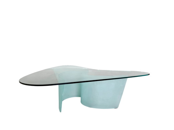We are offering a beautiful glass coffee table from Cattelan Italia for sale. The table has three stable legs made of frosted glass, which can be adjusted independently of each other to support the table top. On one side of the table top, an approx. 1 cm piece of glass is chipped (see pictures).