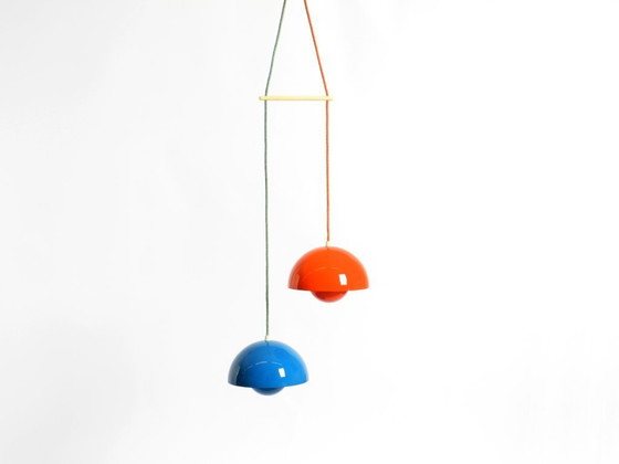 Original enameled double-shade Flower Pot pendant lamp in blue and red from the 1970s.