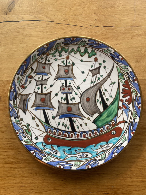 Discover the refined beauty of this hand-painted plate from Icarus Pottery, sourced directly from Rhodes, Greece. The plate is a work of art in itself, adorned with an elegant boat motif. The rich colors of blue, green, and reddish-brown are beautifully accentuated by a refined gold finish, giving this plate a luxurious appearance. With a diameter of 29 cm, it is perfect for both decorative use and serving special dishes. The plate is in perfect condition and makes a beautiful addition to any table setting or wall decoration. Add a piece of Greek art history to your interior with this unique piece.