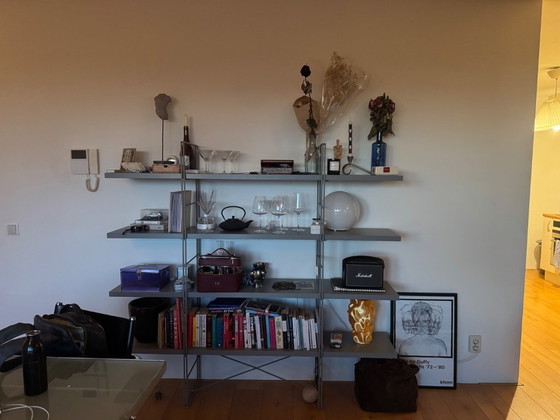 Original IKEA ENETRI wall unit / shelving system featuring metal side frames and grey shelves. It has a clean, industrial look that fits perfectly in a modern interior, office, kitchen, or creative space. A subtle mid century modern retro piece that adds character without overpowering the room.