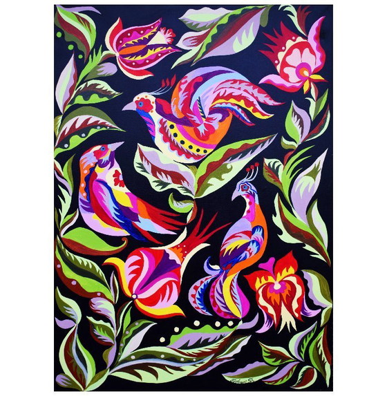 A unique, hand-painted original in a modern folk art style. This vibrant artwork depicts birds of paradise amidst floral motifs against a deep black background, which dramatically enhances the vibrancy of the colors. A perfect eye-catcher for modern interiors, boho design, or as an accent in mid-century modern style.