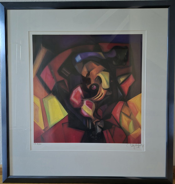 Original screen print by the renowned artist Patty Harpenau, signed and marked EA 23/25 (Épreuve d’Artiste). This means it is an artist's proof from a very small edition of only 25 copies, making this work rarer than regular numbered editions. The artwork measures approximately 90×95 cm and is characterized by powerful geometric forms and warm color contrasts, entirely in Harpenau's recognizable abstract style. The screen print is in excellent condition: the paper is taut, clean, and shows no discoloration. The piece is professionally framed in a stylish dark blue aluminum frame with a glass plate, which perfectly complements the color scheme of the work and provides a modern, sleek look. An ideal artwork for lovers of modern abstract art or for anyone seeking a striking and colorful accent for home or office.