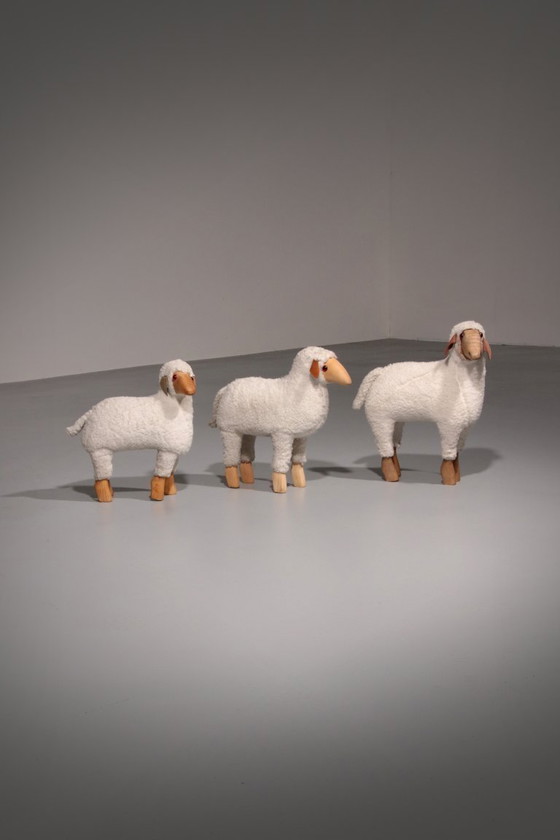Iconic sheep by Hanns Peter Krafft, made in Germany in 1982. These sheep are in their original condition, wonderfully soft (!), and available in various poses, sizes, upholstery, and color shades, both in fabric and wood. Even smaller details like eyes and facial expressions are noteworthy, giving each piece its own unique character. Each sheep has a beautiful patina, which only develops over time and makes them truly unique. Hanns Peter Krafft is known for creating these sheep, driven by the belief that he creates objects that people will cherish for the rest of their lives. Over the years, his ideas have evolved into highly sought-after decorative objects that remain iconic to this day. These fantastic sheep are sold together.