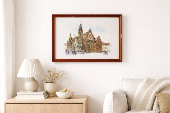 Original watercolor depicting the historic Town Hall of Wrocław (Rynek Square), Poland. A lively urban scene with passersby and finely detailed Gothic architecture, rendered in fresh, luminous colors. Signed and dated 2000 by the artist M. Ody. Presented in a wooden frame under glass, ready to hang.