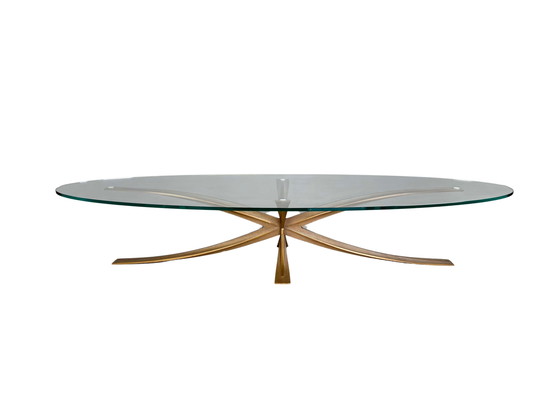 We are offering a beautiful coffee table by Michel Mangematin for sale. The oval table has a star-shaped bronze frame and a completely new, original table top. Mangematin was an architect and designer and studied under Frank Lloyd Wright and Ludwig Mies van der Rohe, among others.