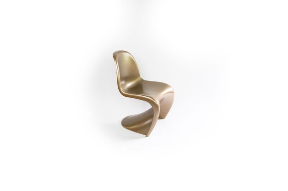 The Panton Chair is a 20th-century design icon and embodies futuristic elegance in its purest form. This metallic gold model is from Vitra and represents the highest quality and originality. The flowing, sculptural form ensures maximum seating comfort and stylistic presence, whether as a stand-alone piece, an eye-catcher in the dining area, or a highlight in the photo studio.