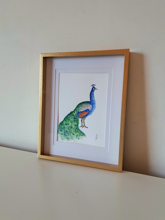 Handmade and original watercolor painting of a peacock, framed and ready to hang or display. Made on 300-gram paper. The gold-colored frame measures 20x25 cm and features a double mat. Each item is original, so only one has been made.
