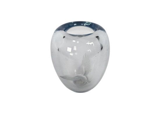 Discover the timeless elegance of the 'Petite Bird Paradise' vase, a masterpiece by Orrefors, designed by HALD Lindstrand in the 1960s. This beautiful vase captures the essence of Scandinavian design with its refined glasswork and subtle engraving of a bird in flight.