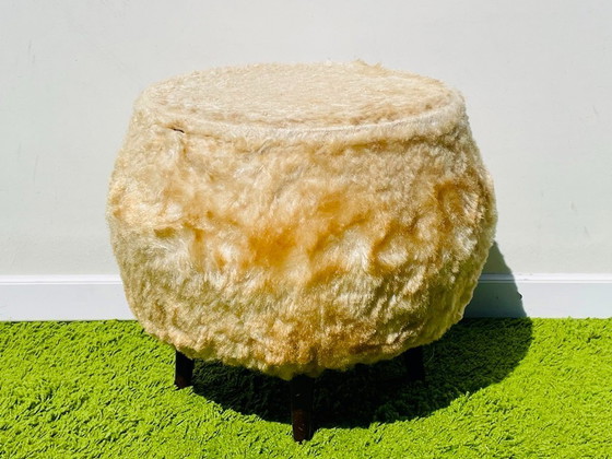 Ottoman stool/storage chest. Vintage 1950s. In plush synthetic fabric and faux leather. Wooden compass legs. The seat opens to reveal a storage compartment. Diameter: 45 x Height: 40 cm.