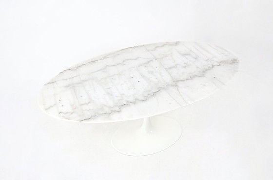 Oval marble table with aluminum base designed by Eero Saarinen and produced by Knoll. Stamped Knoll. Wear due to time and age of the table.
