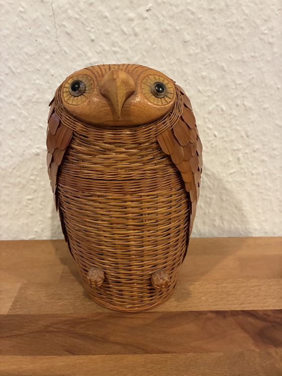 Depicts an owl, beautifully handcrafted, with natural wood tones. Maximum height (head) 18.5 cm, depth 12 cm, width 12.5 cm. The owl is in good overall condition, clean inside. Nothing is broken.