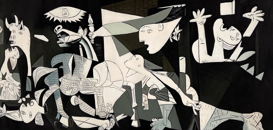 Guernica is a monumental and poignant work that symbolizes human suffering and the devastating impact of violence. In this hand-painted interpretation, the powerful black-and-white composition comes into its own: fragmented figures, screaming faces, and sharply cut forms fill the picture plane with tension and emotion.