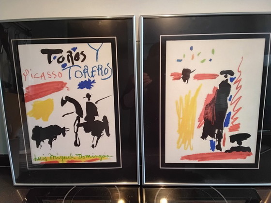 Discover the vibrant world of bullfighting with these beautiful artworks by Pablo Picasso, titled 'Toros Y Toreros' from 1961. These lithographs, specially designed by Picasso for this edition for the cover of this publication, capture the dynamism and energy of the arena with Picasso's signature style and expressive brushstrokes.