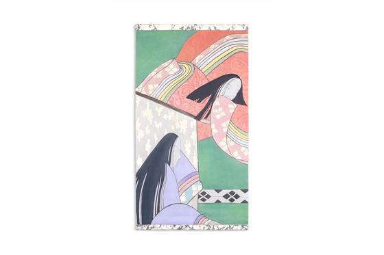 Painted canvas, or decorative panel, depicting stylized Japanese dances.