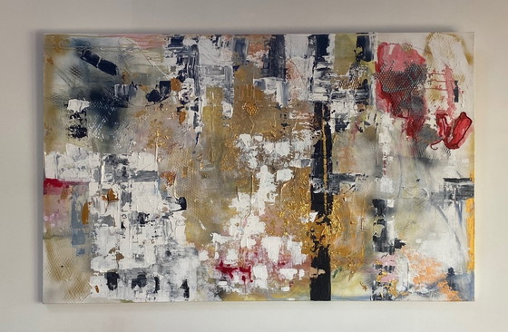 Bring a touch of abstract art into your home with this beautiful painting. The blend of gold, black, white, red, and gray creates a dynamic and captivating image that will bring any room to life. Perfect for the living room or above the dining table, this artwork adds a modern and stylish touch to your interior.