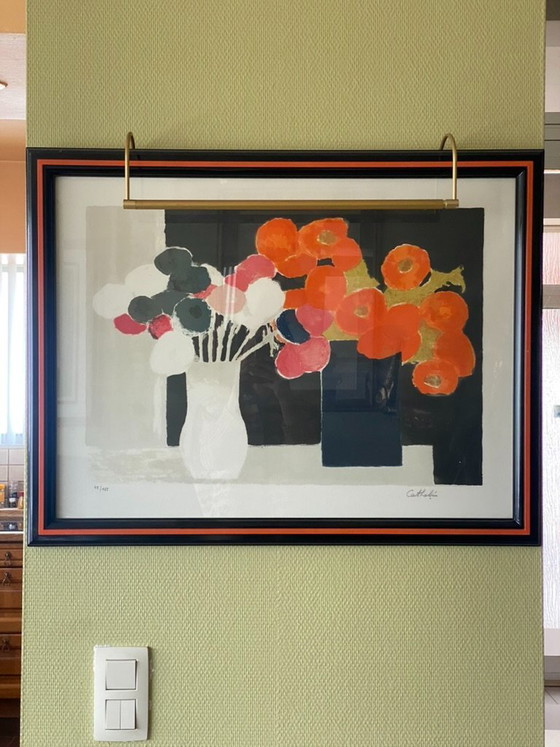 Discover the vibrant beauty of the painting 'Bouquets de soucis et d'anémones' by Cathelin. This artwork captures the essence of flowers in a modern style, featuring a striking color scheme of orange, red, and black against a white background.