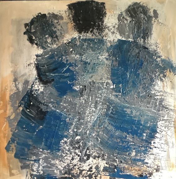 Immerse yourself in the evocative world of abstract expression with this captivating painting by EllesBB, titled "The Three of Us." This piece invites viewers to explore the dynamic interplay of color and texture, with bold strokes of blue and grey creating a sense of movement and depth.