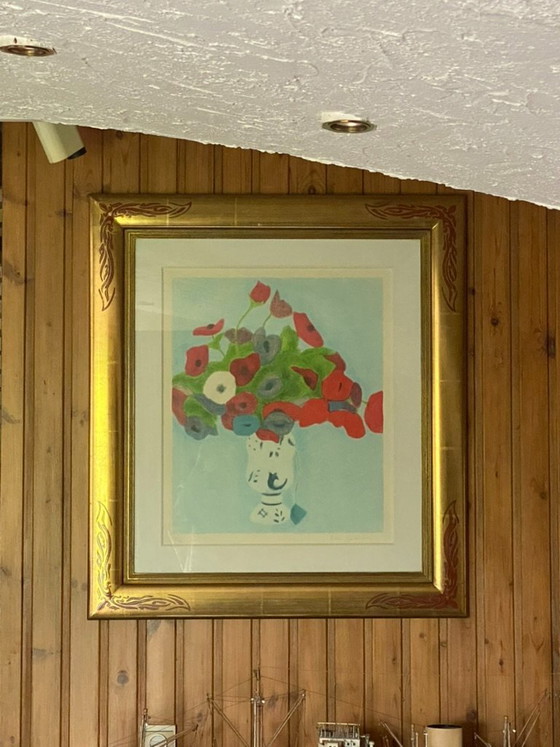 This beautiful painting by Pierre Boncompain brings a lively and colorful touch to any room. The work features an expressive depiction of flowers in a vase, with a harmonious blend of red, green, and blue hues that catch the eye.