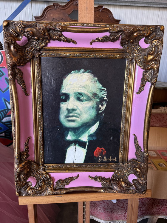 Bring a piece of film history into your home with this unique painting of Don Corleone, signed by renowned artist Peter Donkersloot. The portrait captures the iconic look of the legendary mafia boss in vibrant colors and detailed brushstrokes. The striking gold frame with pink accents gives the whole piece a modern twist, making it a real eye-catcher in any room.